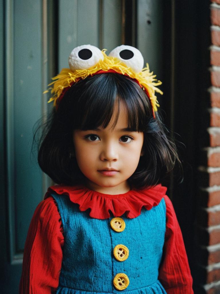 Child in Rosita Costume, photorealistic Sesame Street cosplay portrait, cinematic realism