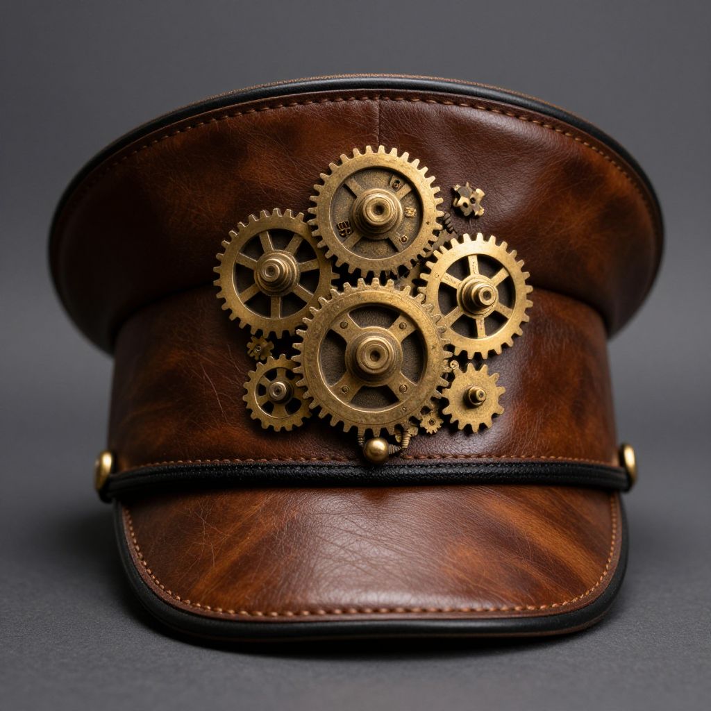 An emblem of steampunk elegance and military precision, this hat whispers tales of industrial dreams and the timeless pursuit of order, its golden gears and polished leather hinting at a world where progress and tradition intertwine.