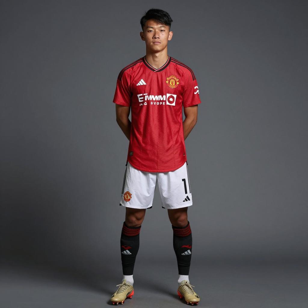 Full-length studio portrait of a young Asian male soccer player standing against a dark gray gradient background. He is wearing a red Manchester United football jersey with white and yellow accents, white shorts with the Manchester United logo, black socks with red stripes, and beige soccer cleats. The player has short black hair, stands with arms behind his back, and has a serious expression. The image is well-lit with studio lighting, focusing on the subject.