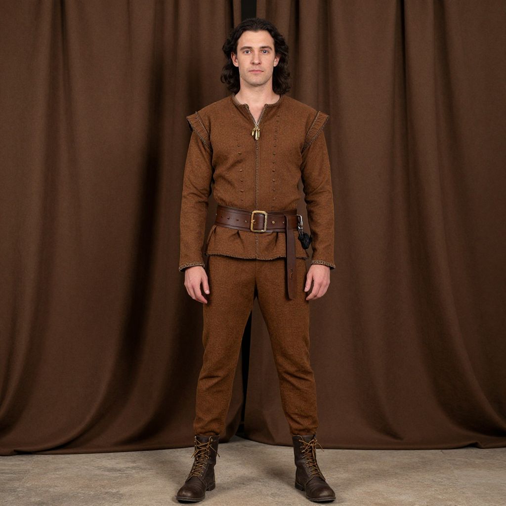 Renaissance Faire Peasant Costume Male, man in a brown outfit standing in front of a curtain