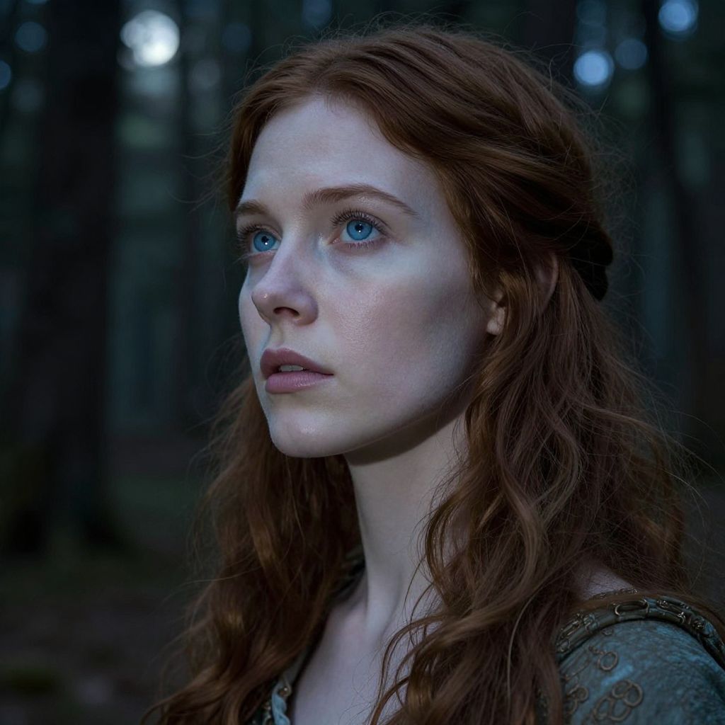This is a photograph of a young woman with fair skin, blue eyes, and long, wavy red hair. Her expression is serious and contemplative. She wears a textured, dark green garment with intricate patterns. The background is a dark, blurry forest with tall trees, and a faint white light is visible in the distance, creating a moody, twilight atmosphere. Her skin has a subtle, natural glow, and her makeup is minimal, highlighting her natural beauty. The image has a slightly surreal, ethereal quality, with a focus on her face and upper shoulders.