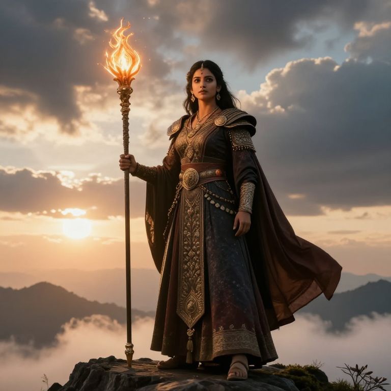 Photorealistic digital artwork of a confident woman standing on a rocky outcrop during sunset. She has long, dark hair and wears ornate, medieval-style armor with intricate gold and silver patterns, along with a flowing dark cape. She holds a tall, ornate staff with a flaming torch at the top. The background features a dramatic sky with golden sunlight peeking through clouds, and silhouetted mountains. Her expression is determined, and she stands with one foot slightly forward, exuding strength and authority. The textures of the armor are detailed, and the overall mood is epic and heroic.
