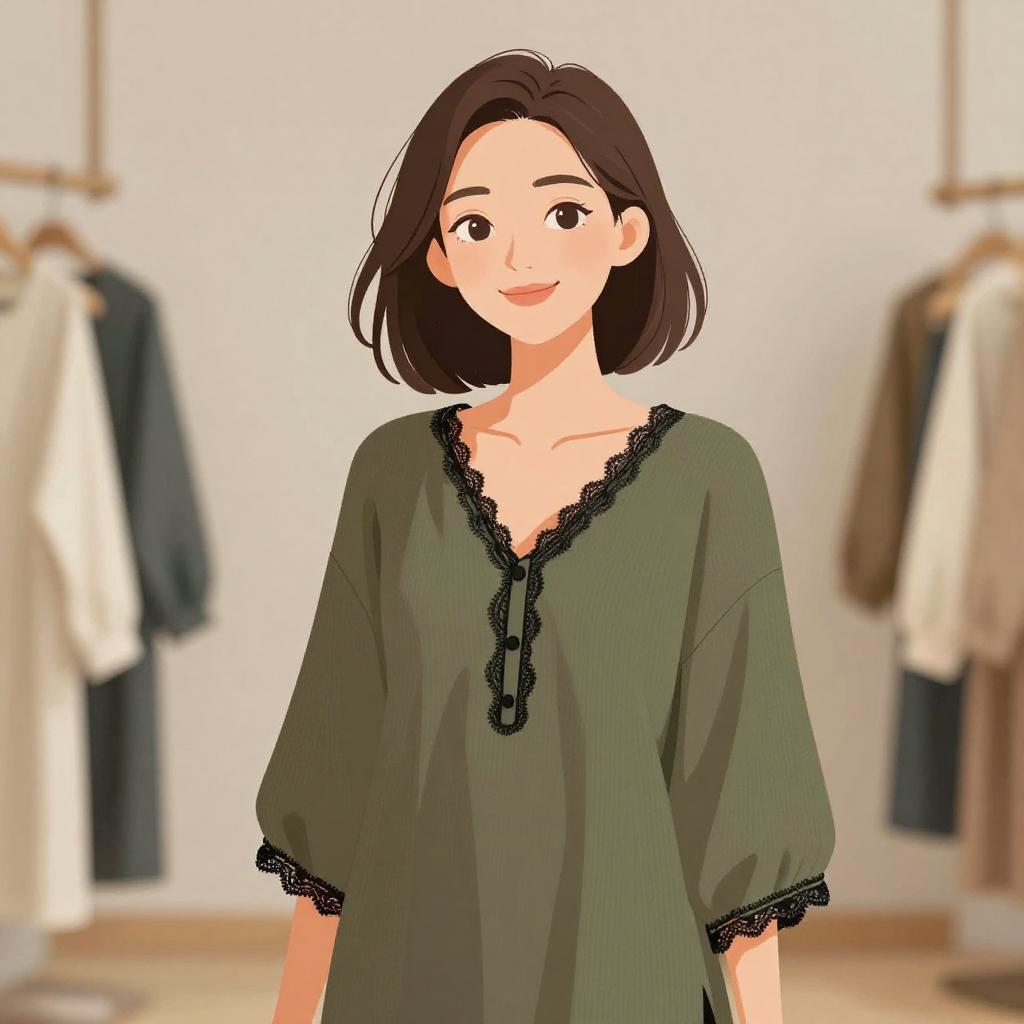 Woman with pretty face and pretty hair. smiling Woman, casual bohemian, olive green long-sleeve tunic top with button details, V-neckline with black lace trim, loose-fitting, soft fabric, neutral backdrop with soft lighting in a retail environment. --sref 1467