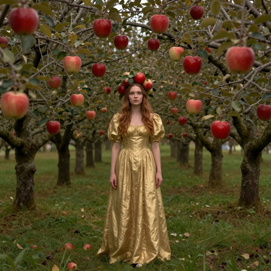 Photograph of a young woman with fair skin and long, wavy auburn hair standing in an apple orchard. She wears a golden, satin dress with puffed sleeves and a floral crown of red apples. The orchard has rows of apple trees with red and green apples hanging from the branches. The background shows a green, grassy field, and the sky is overcast. The woman stands centered, with apples blurred in the foreground and background, creating a dreamlike, enchanting atmosphere. The overall style is whimsical and fairy tale-like.