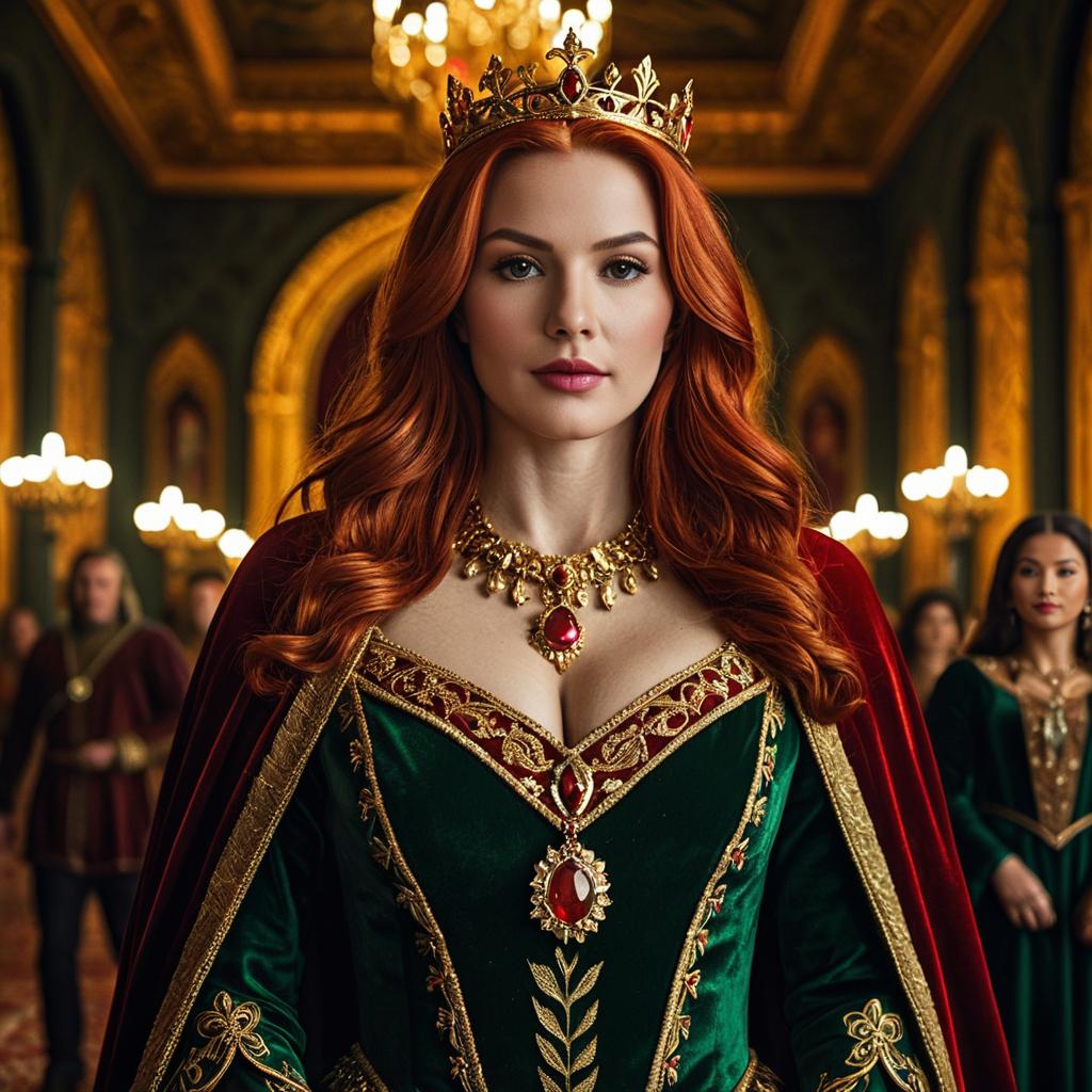Medieval festival clothing, photorealistic medieval princess, front view, standing under green leafy archway, long wavy auburn hair, light skin, delicate face, blue eyes, detailed ornate headpiece, corset-style dress, red and gold colors, light blue sleeves, gold and red cloak, intricate necklace with pendant, hands clasped in front, slightly blurred background with people and market stalls, soft natural light, outdoor setting, fantasy style, slight magical realism, CGI, T2I, medieval fair, elegant and regal, detailed ures, realistic shadows