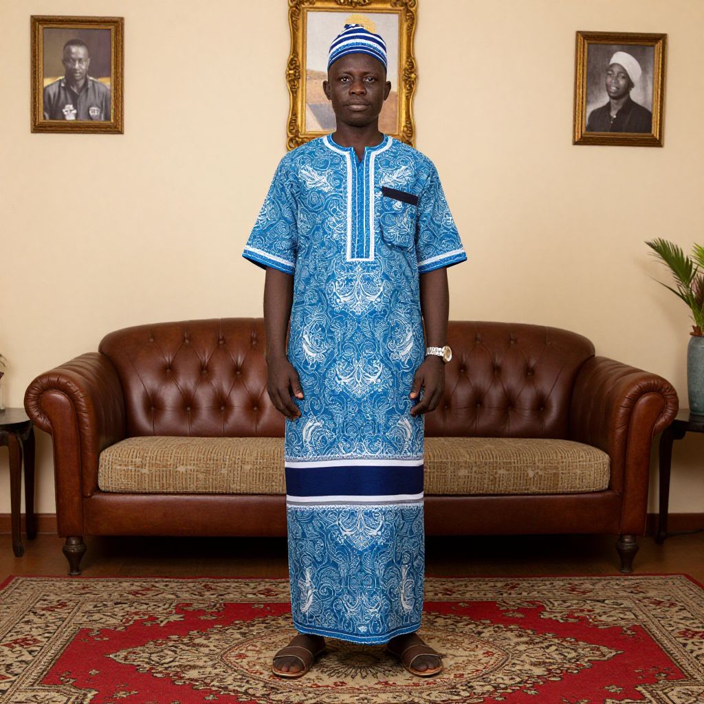 Photograph of a Black man standing in a room, wearing a blue and white patterned traditional kaftan with short sleeves and a matching headwrap. He has a medium build and dark skin. Behind him is a brown leather tufted sofa with a gold-framed portrait of an elderly man in the center and another framed portrait on the right. The room has cream-colored walls and a red patterned rug on the floor. A small green plant is in the right corner. The man wears a wristwatch and brown shoes.