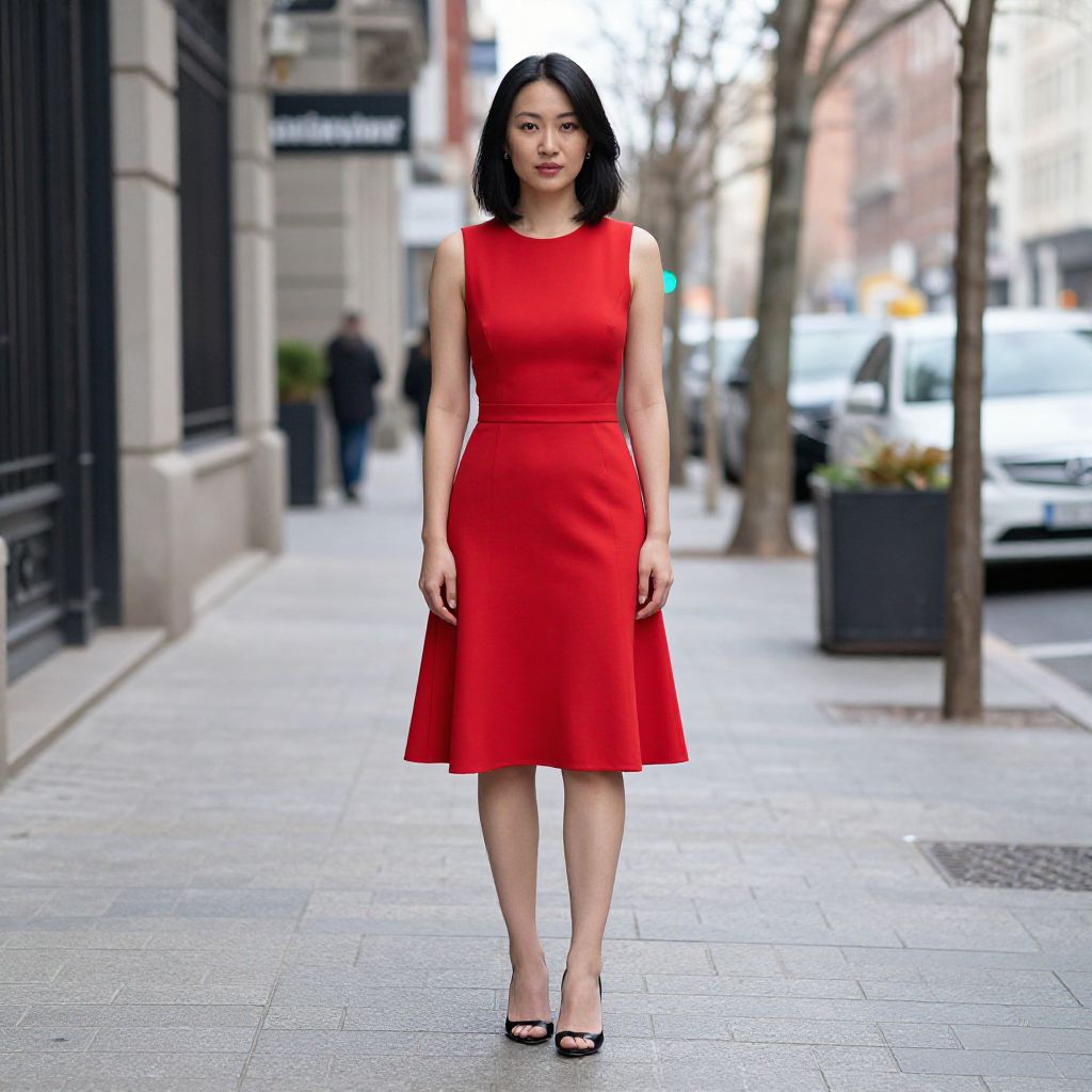 Turning Red Dress, woman in red dress standing on sidewalk in urban setting