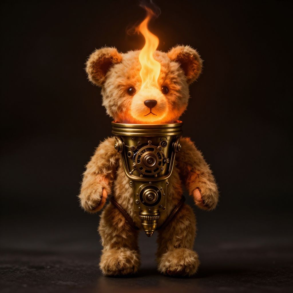 Steampunk teddy bear torch made of brass and glowing flame, intricate mechanical parts combined with soft teddy textures, glowing embers, dramatic lighting, futuristic style