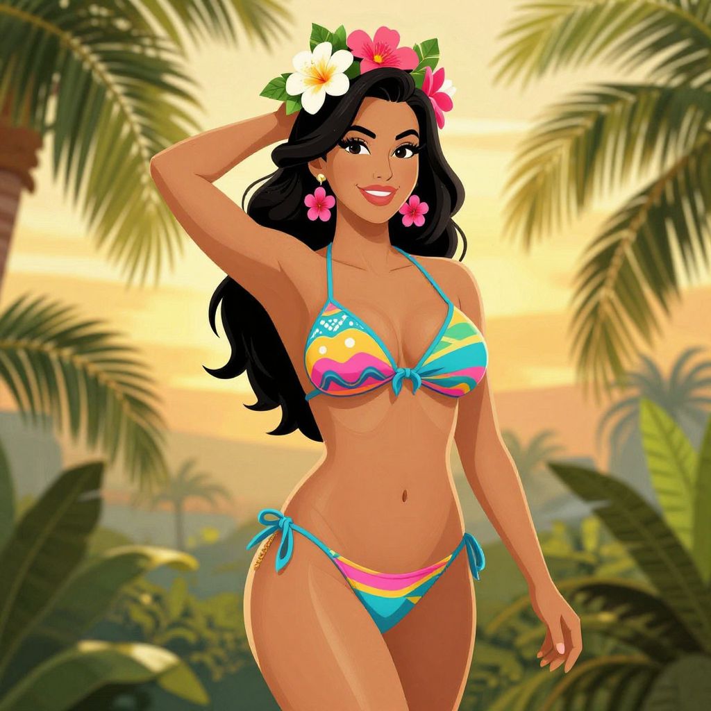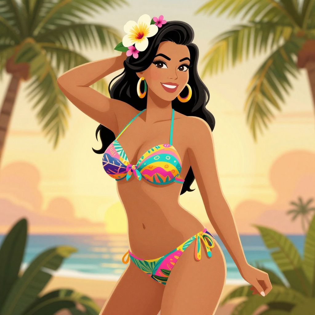 Digital illustration of a smiling, tan-skinned woman with long black hair, wearing a colorful, patterned bikini, large gold hoop earrings, and a