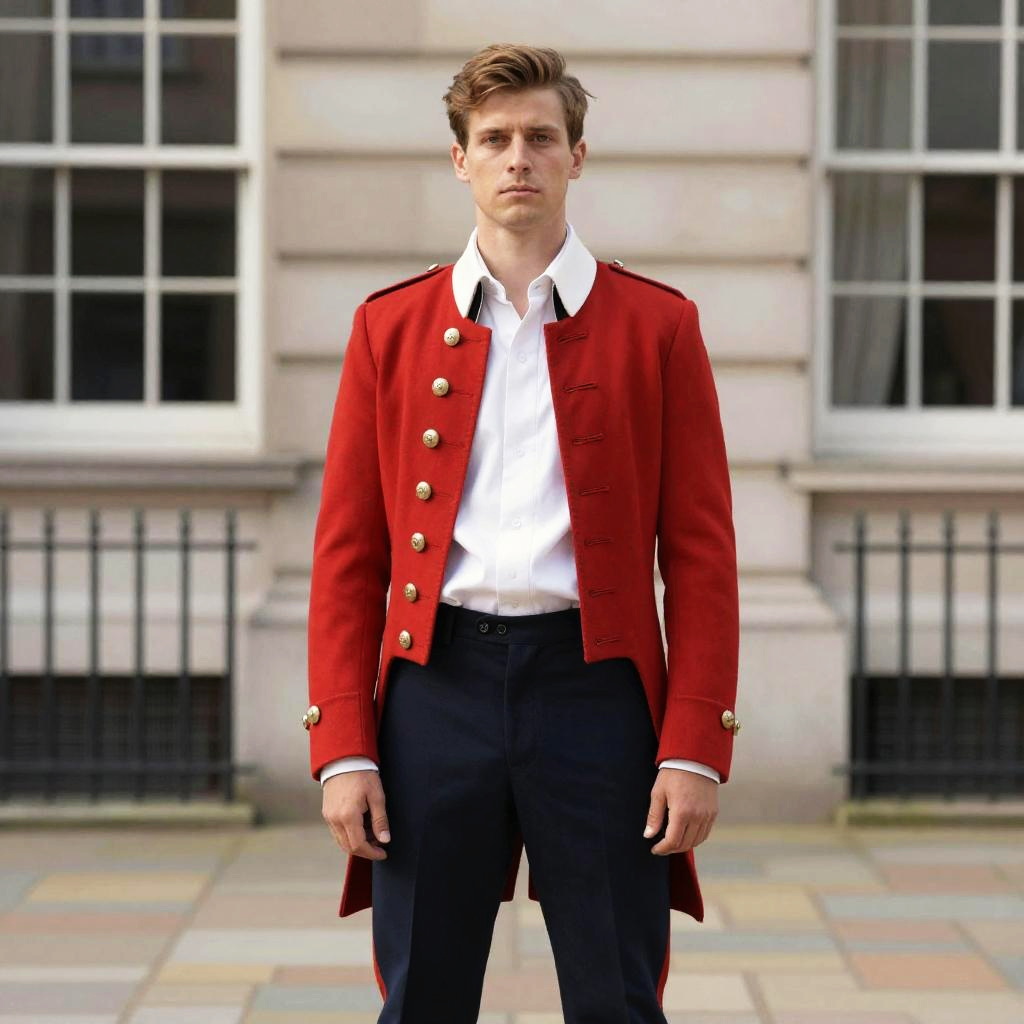 Man British Red Coat Costume, man in red coat and white shirt standing in front of a building