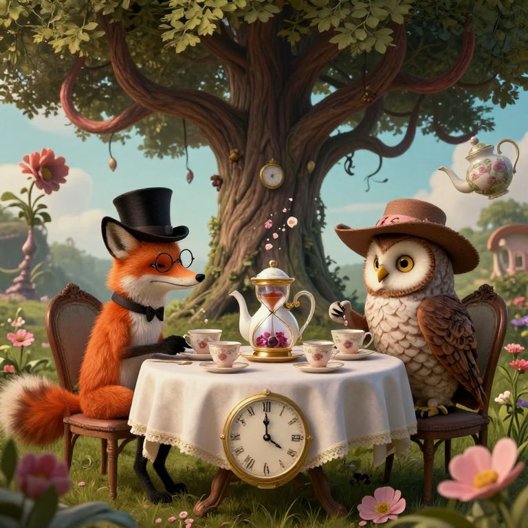 This digital artwork depicts an anthropomorphic fox and owl having tea under a large, leafy tree. The fox, with orange fur and a black bow tie, wears a black top hat and glasses, seated on the left. The owl, with brown and white feathers, sports a brown hat and is on the right. They sit at a white-clothed table with a teapot, cups, and saucers. A large clock with Roman numerals is at the table's center. Pink flowers and a clear blue sky with fluffy clouds fill the background. The fox and owl engage in conversation, with the owl holding a cup.