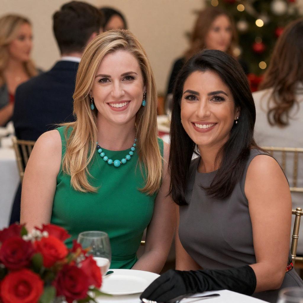 Photograph of two women seated at a table, smiling. Blonde woman in green dress with turquoise necklace, dark-haired woman in gray dress. Red flower arrangement, black gloves on table. Blurred people in background. Warm, festive lighting.