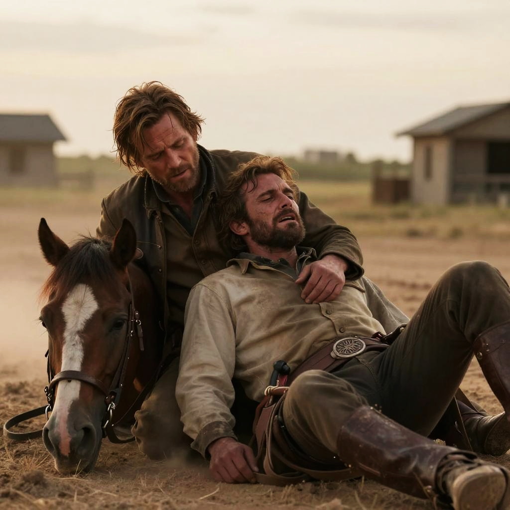 Arthur Morgan dying on a rustic wooden porch of a frontier cabin, dusk setting, subtle tears, worn-out rugged look, natural surroundings blending with sorrowful ambiance, high realism