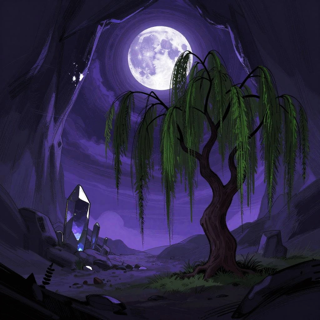 An art nouveau illustration depicting a blooming garden under a rose gold moon, casting ethereal light over the landscape. In the foreground, a towering willow tree stands silhouetted against the backdrop, rendered in dynamic brush strokes and bold lines.
