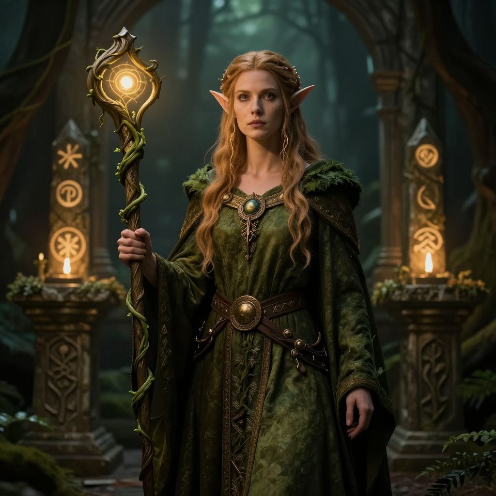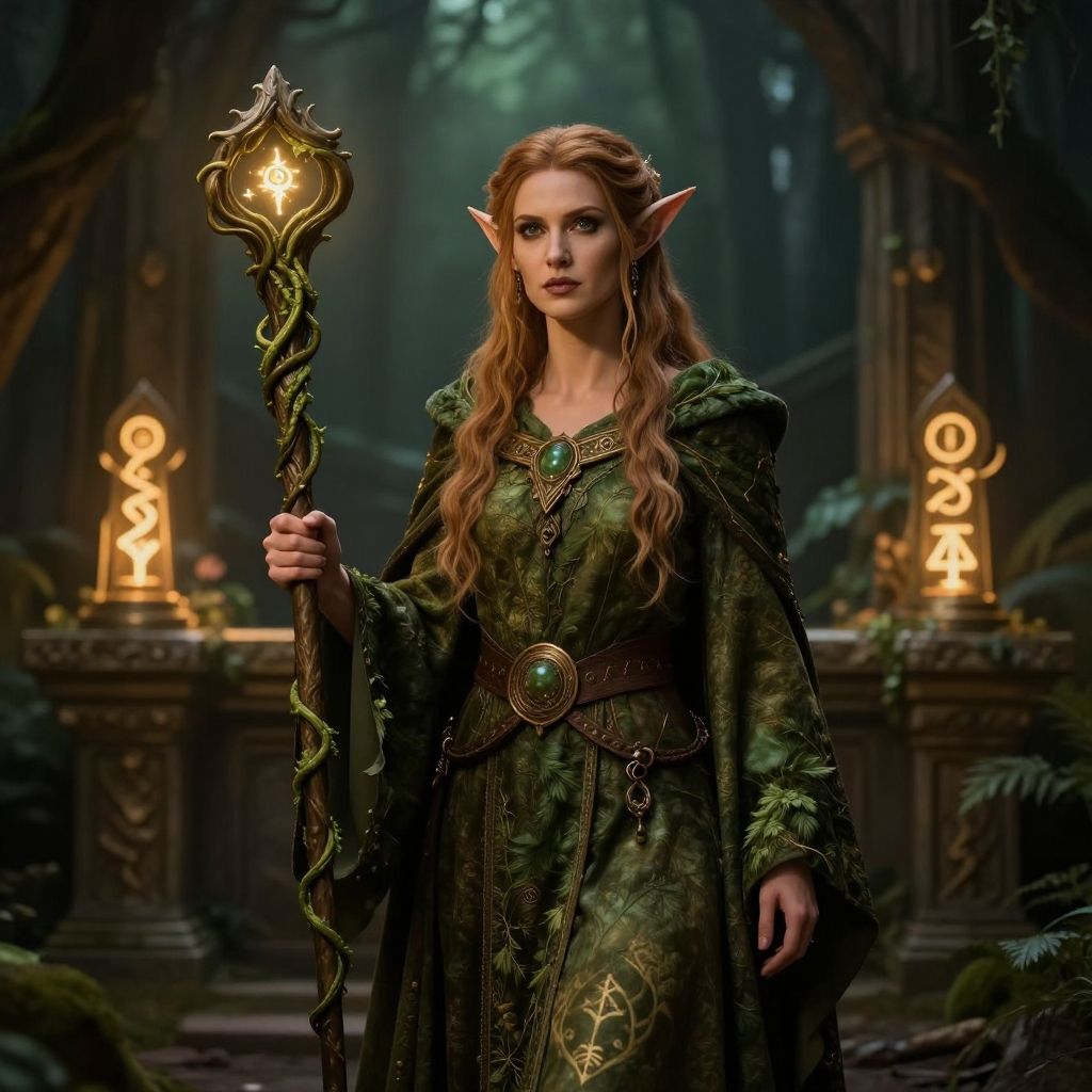 Digital fantasy artwork of a slender, elven woman with long, wavy auburn hair, wearing a green, ornate robe, holding a