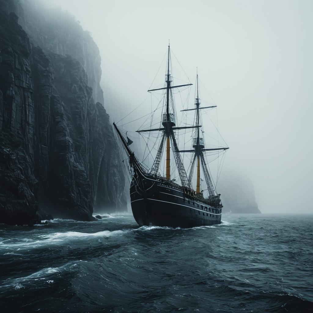 A dark, photorealistic image of a tall sailing ship navigating through thick fog near steep rocky cliffs. The mysterious atmosphere is enhanced by the misty environment and the ship's detailed masts and rigging. The sea appears choppy under low light, with the rugged cliffs partially obscured by fog.