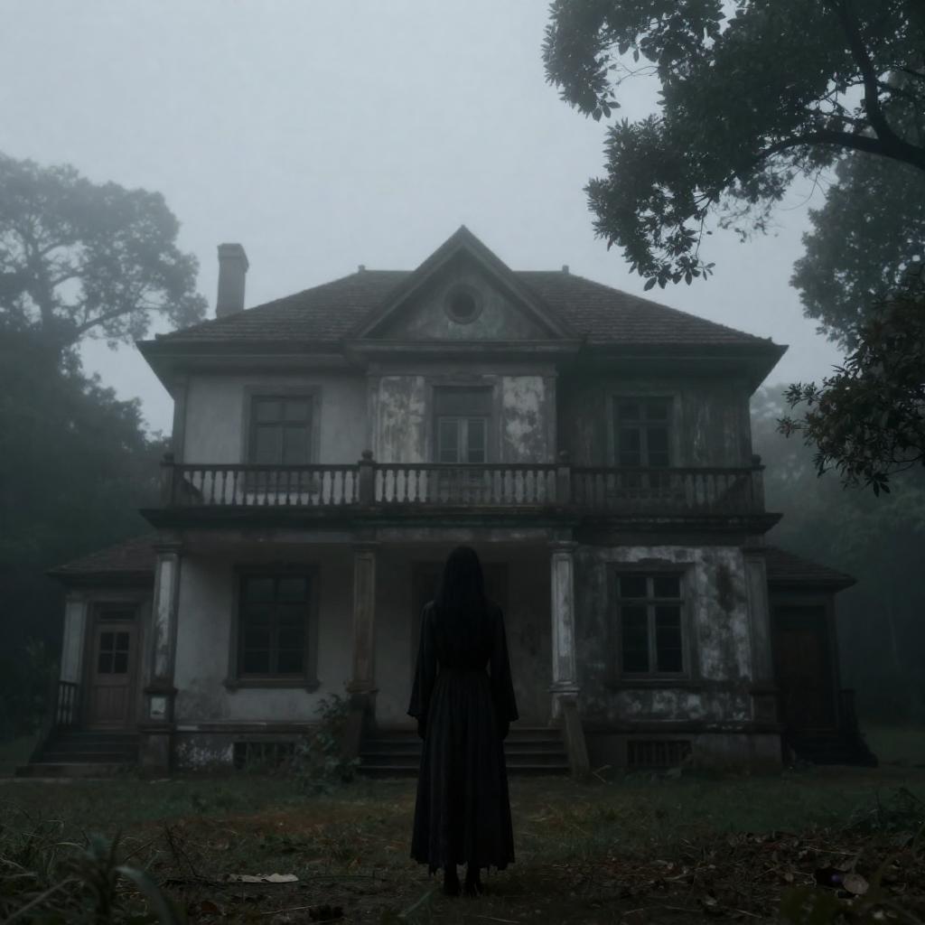 A dark, atmospheric photograph shows a tall, shadowy figure in a long, tattered dress standing in front of a mist-covered, old, two-story house. The house is partially obscured by trees on the right and left, with a bright, overcast sky in the background.