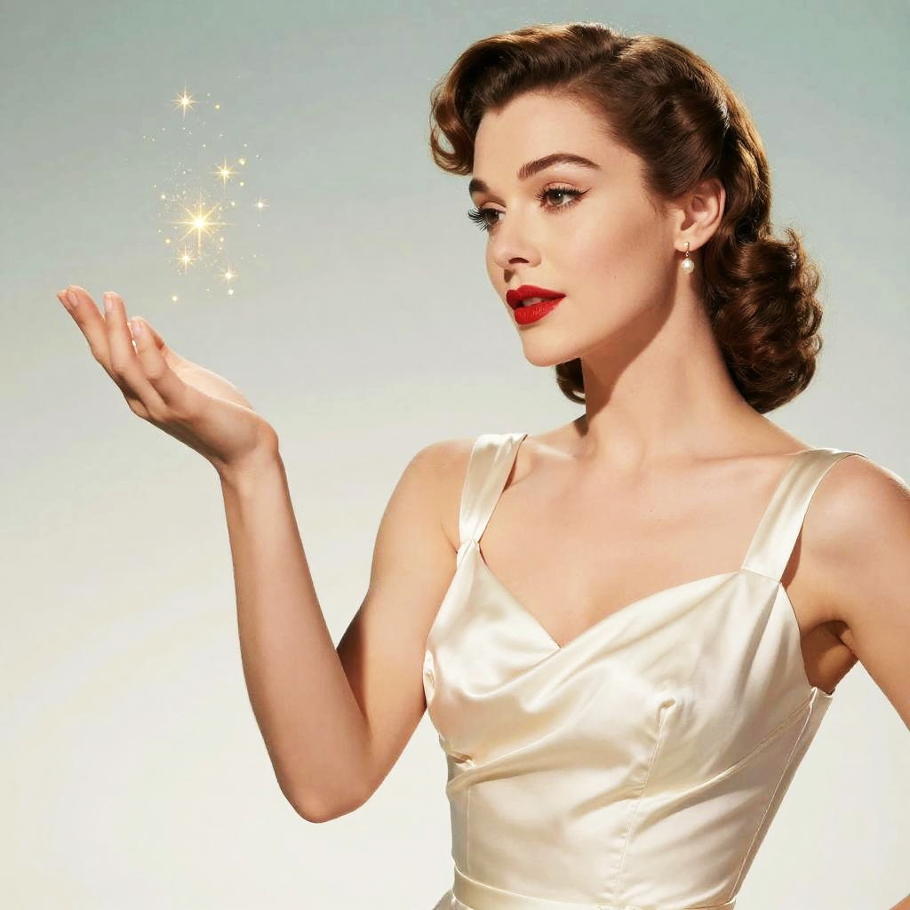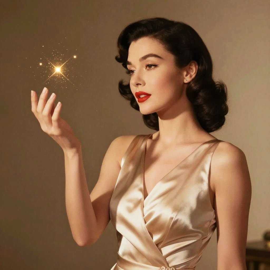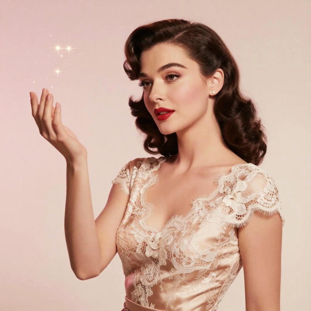 A glamorous woman with a vintage Hollywood style, elegant makeup with red lips, wearing lace adorned silk dress, sparkling golden light particles floating from her hand, soft blush pink and ivory background, soft glow lighting, classic and sophisticated atmosphere