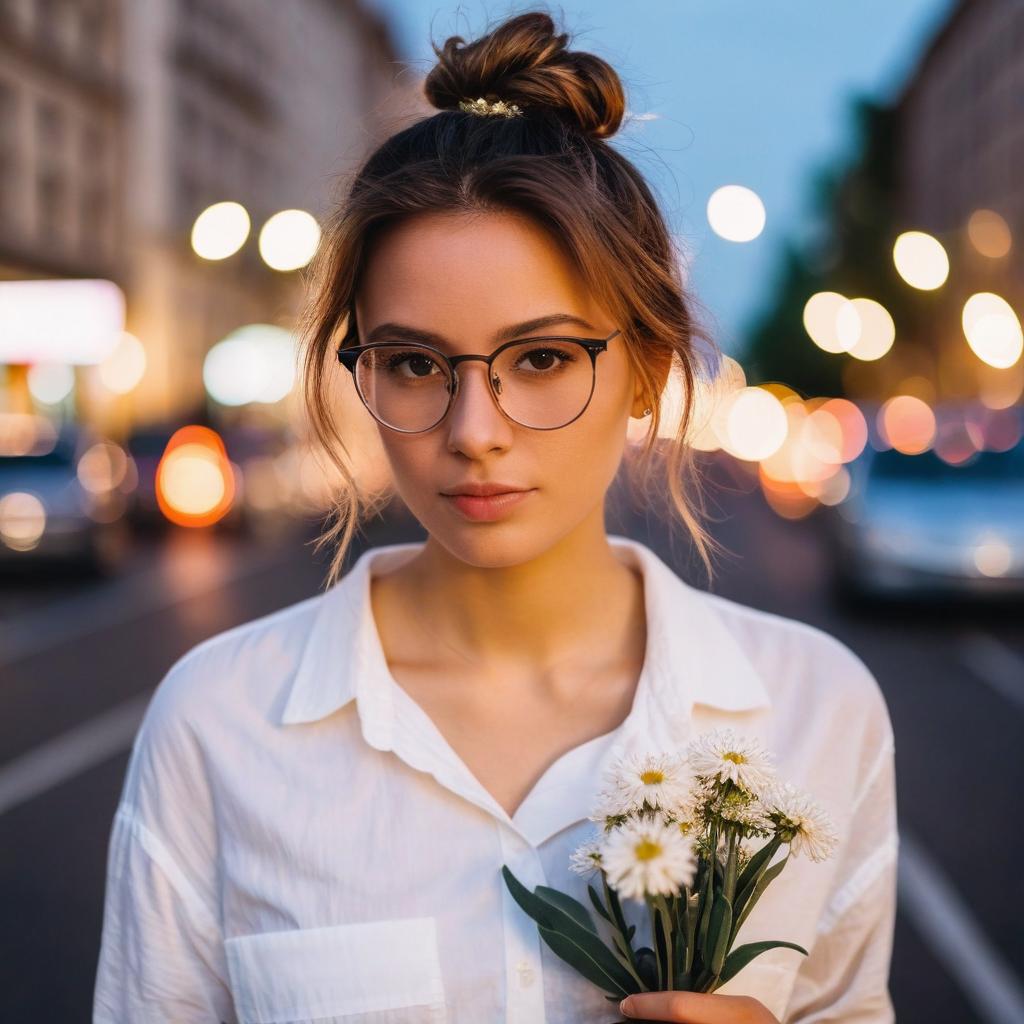 A young woman wearing glasses and a black leather jacket standing near a neon sign glowing in blue and red colors, moody night urban scene with cinematic lighting and soft bokeh effect in the background, cyberpunk style reflections on glass, vibrant neon blue and red colors with a dark contrasting background