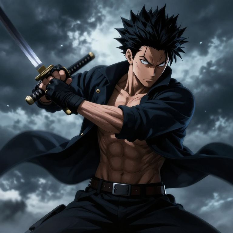 Toji Fushiguro appearance, muscular build with rugged features, tousled black hair, wearing a dark combat jacket and gloves, gripping a katana, stormy sky background, dynamic action pose