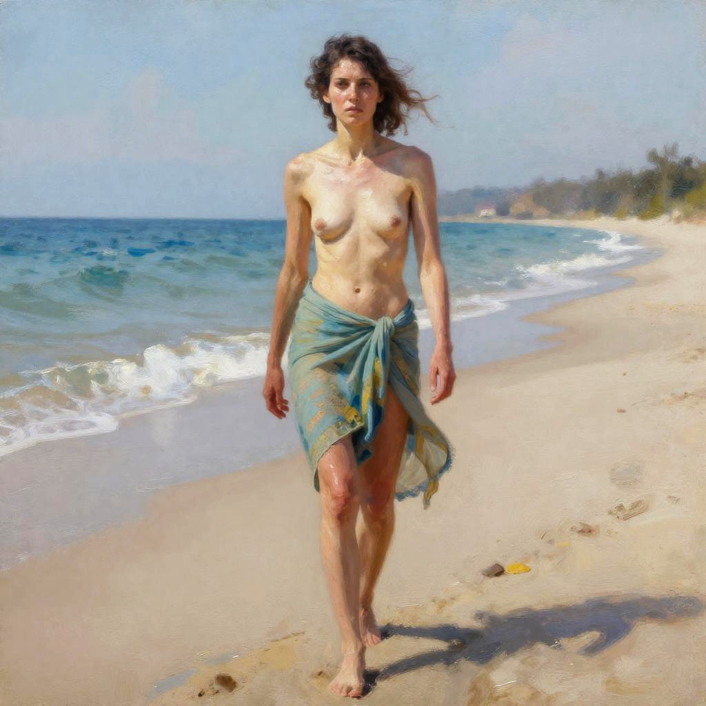 Realistic photo.Turbulent slender woman 35 years old wearing a sarong with a thoughtful expression, approaching us along a lonely beach by the sea during summertime in ethereal realism - oilpaints style, watercolors, colored inks style, inspired by Gustav Klimt, Pierre-Auguste Renoir, Amedeo Modigliani::0.4 realistic photo