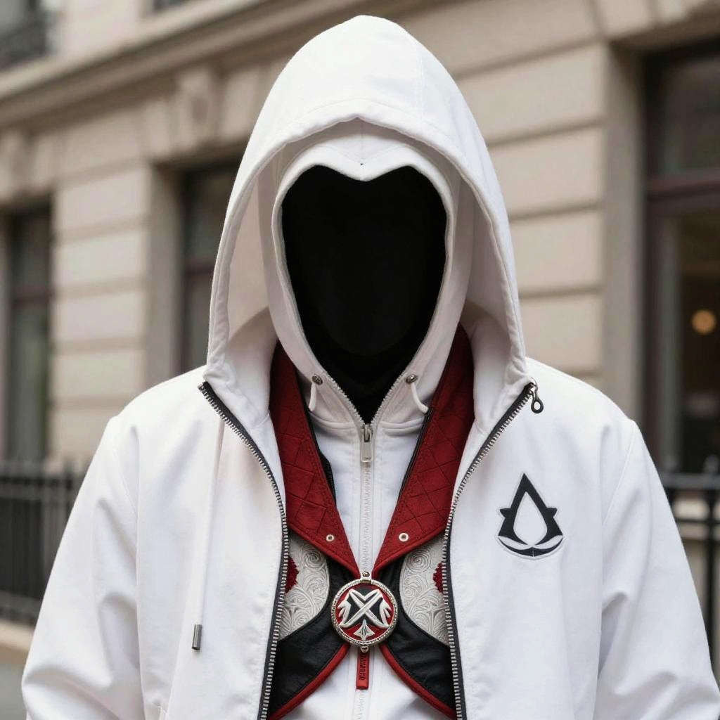 Close-up shot of a person wearing a custom Assassin's Creed-inspired hooded jacket and outfit, featuring a white hood, detailed red and black accents, and the Assassin's Creed emblem. The face is obscured by a black void-like mask. The setting appears to be urban with a blurred building facade in the background.