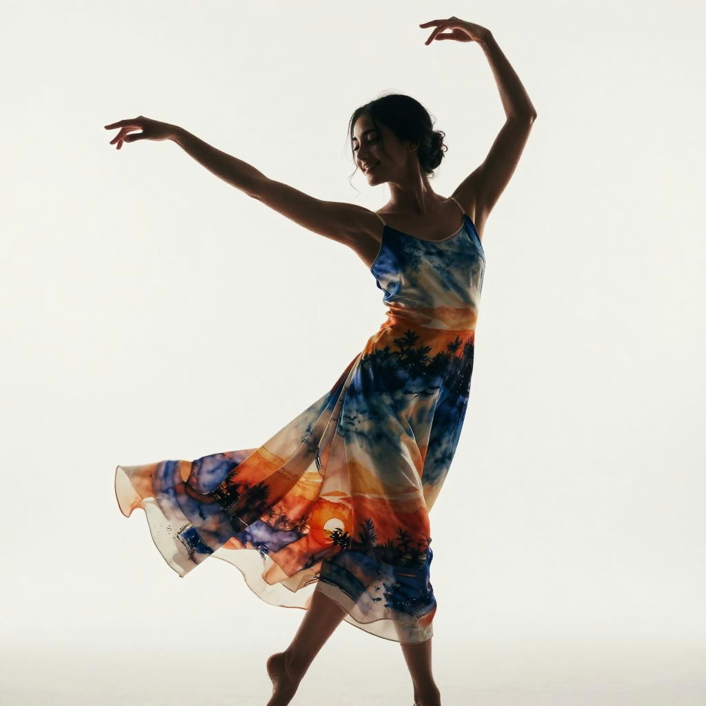 [(white background:1.3) : cinematic photo, (charming splendid young female character silhouette, wearing dress made of watercolor sketch of sunset printed on silk), slightly smiling and posing-dancing, 4k resolution, detailed, focused . 35mm photograph, film, bokeh, professional, 4k, highly detailed :2]