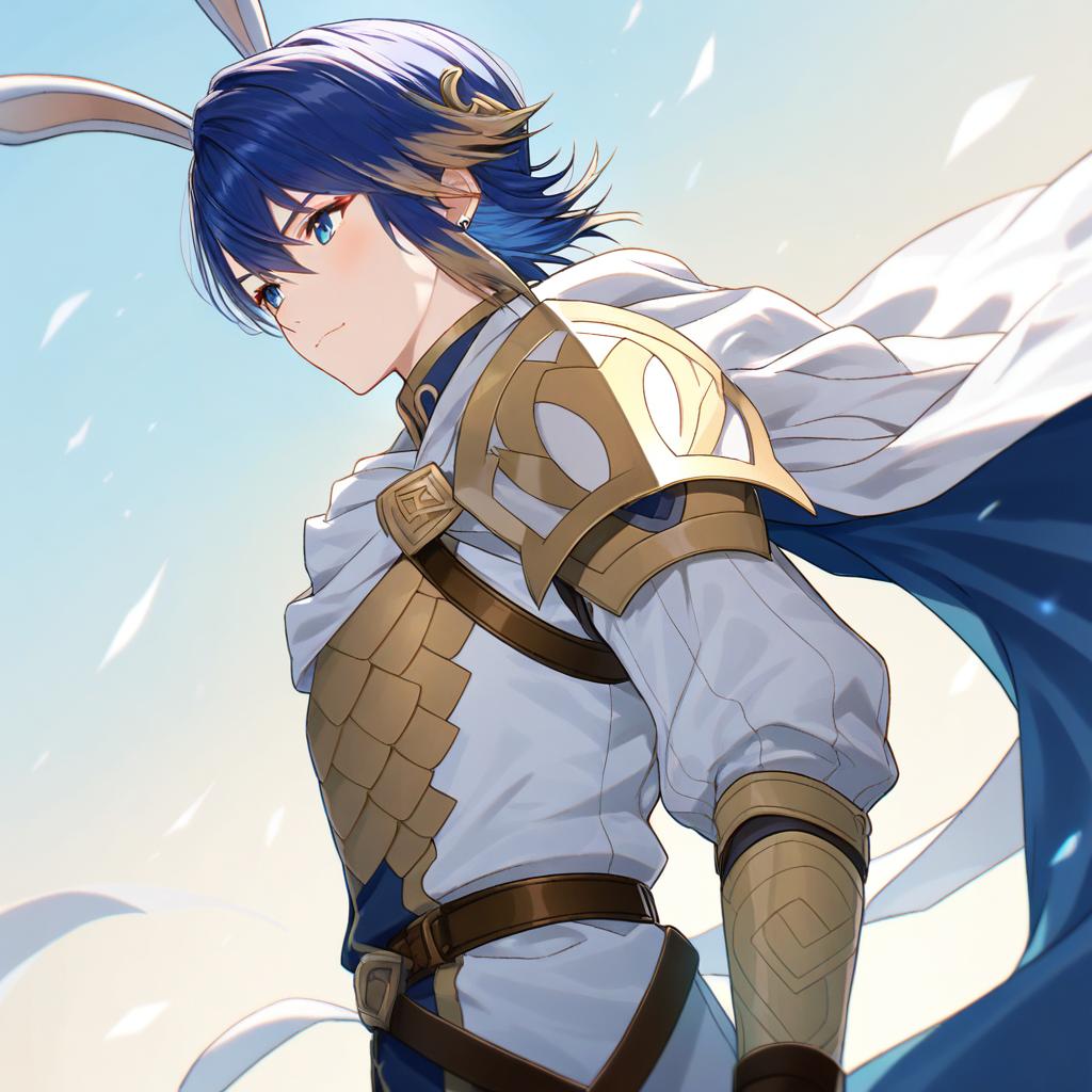 Alfonse (fire emblem), fire emblem, 1boy, rabbit ears, blue eyes, blue hair, blonde hair, two-tone hair, scale armor, gloves, cape, by artist kanden sky, animagine