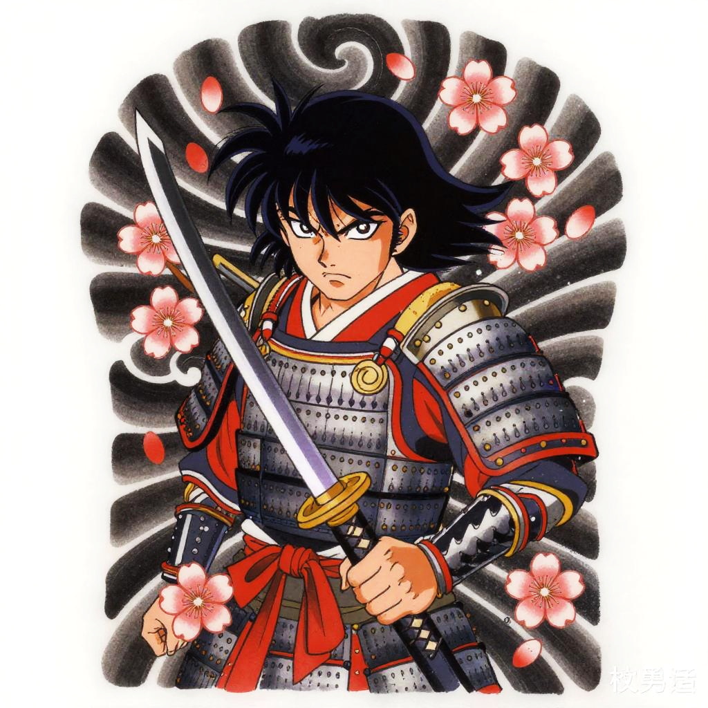 Traditional style anime tattoo of a fierce samurai warrior with intricate armor, sharp katana, expressive eyes, surrounded by cherry blossoms and swirling wind, in bold black and red inks.