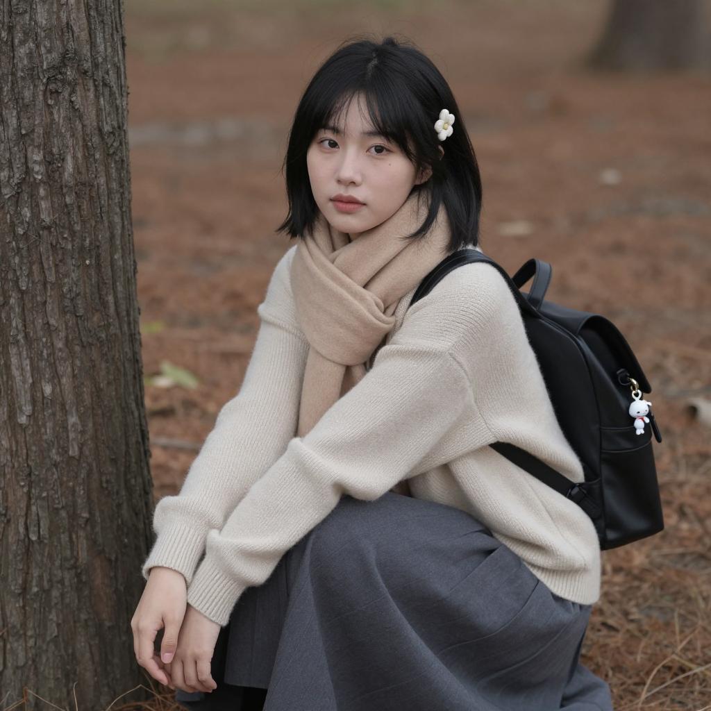Asian girl with short black hair, pale skin, sitting on wooden bench in forest. Wearing beige knit sweater, light blue dress, dark knee socks, brown shoes. Large beige scarf around neck. Black handbag on bench to her left. One leg crossed over the other. Hands touching head and bench. Trees and pine needles in background. Calm expression. Natural light. Photographic style.