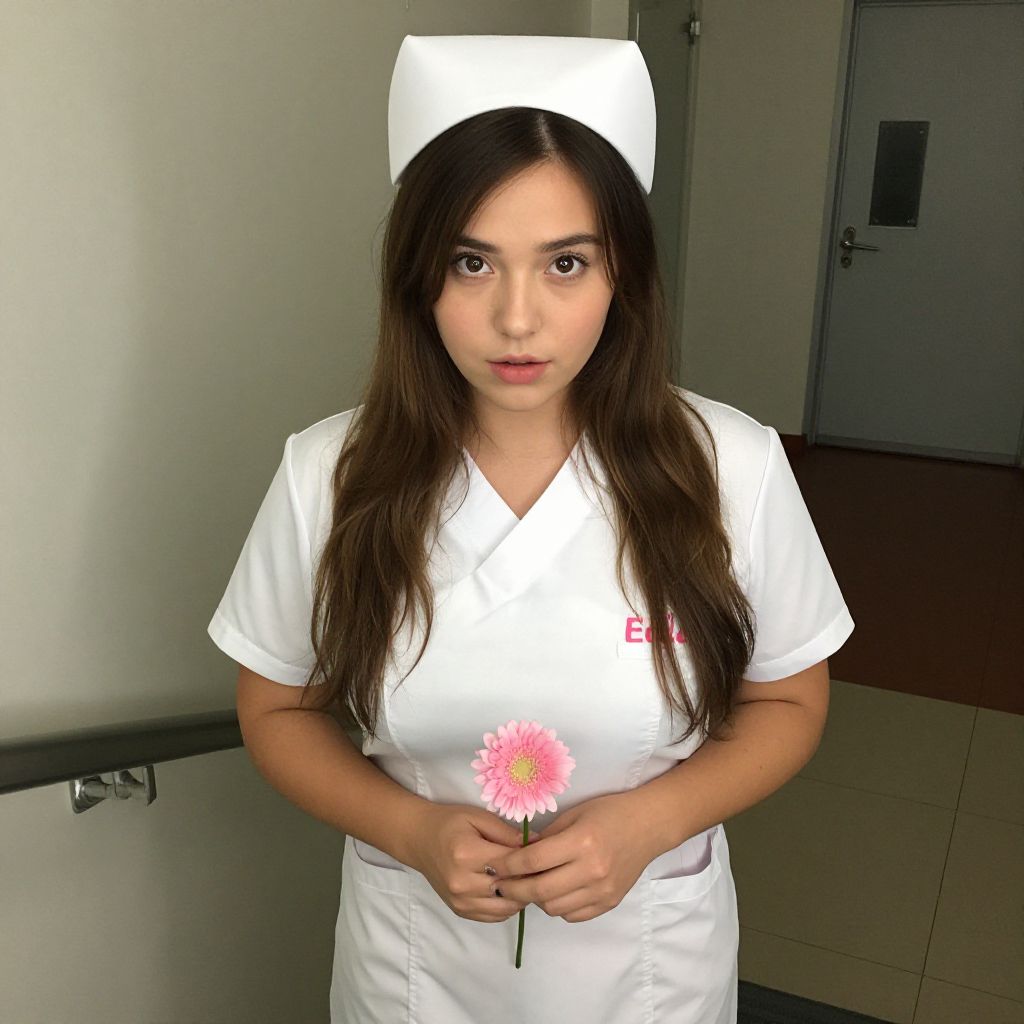 Elle driver nurse plus size, 1girl, solo, hat, nurse, brown hair, nurse cap, pantyhose, long hair, flower, standing, looking at viewer, brown eyes