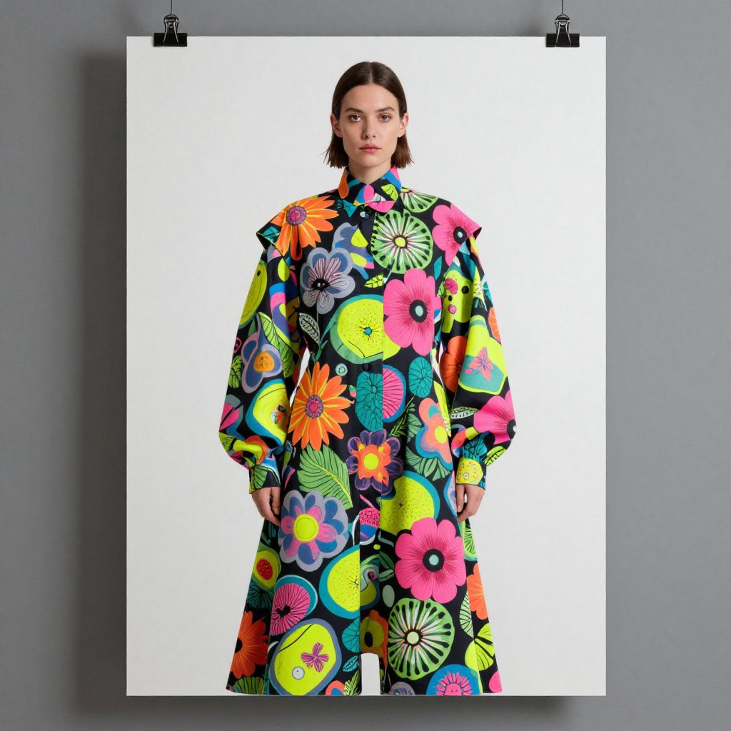 Underpainting european woman, balenciaga style floral bright modern neon pattern collection 2023 hanging, color grading, f 1,0 , 10 mmm, Hasselblad photographgy masters, tim walker,
