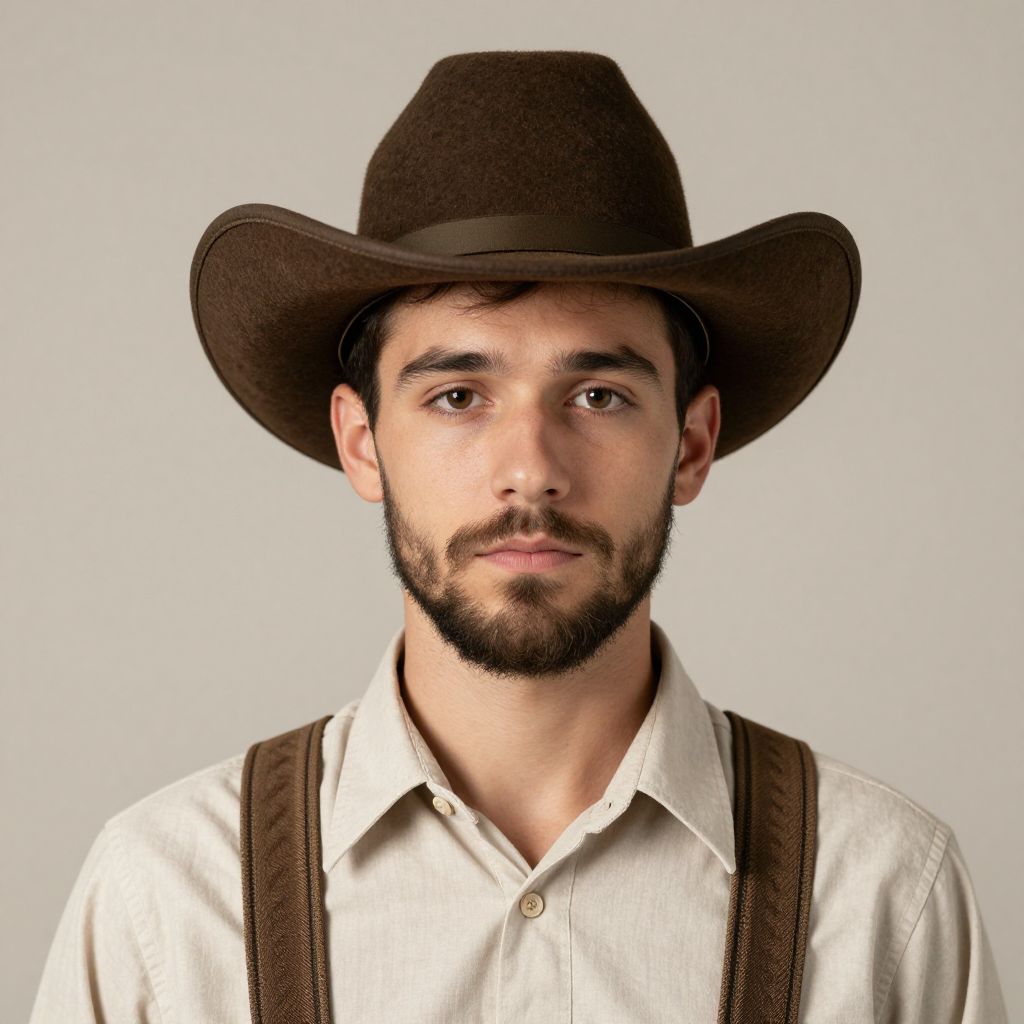 Photograph of a young man with light olive skin and a short, dark brown beard, wearing a wide-brimmed, dark brown cowboy hat and a white, button-down shirt with brown suspenders. His brown eyes gaze directly at the camera with a neutral expression. The background is a plain, light grey, providing a simple, unobtrusive backdrop that emphasizes the subject. The man's facial features are symmetrical, and his hair is dark and neatly trimmed. The image has a clean, studio-quality look with even lighting.