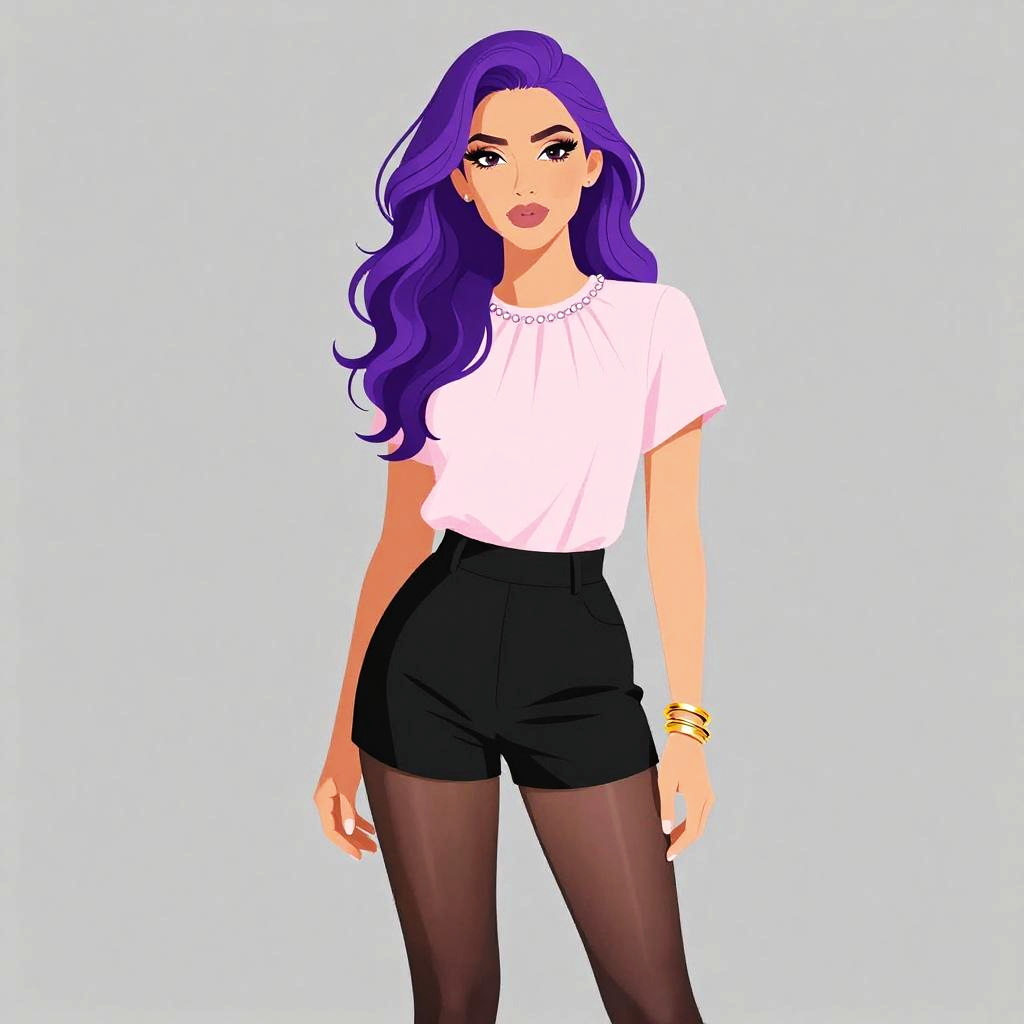 Woman with pretty face and pretty hair. Woman, contemporary chic, pale pink blouse with pleats, jewel-embellished round neckline, short sleeves, high-waisted black shorts, relaxed fit, sheer black tights, multiple golden bracelets, neutral makeup, long wavy hair, grey studio background. --sref 1467