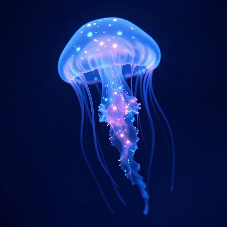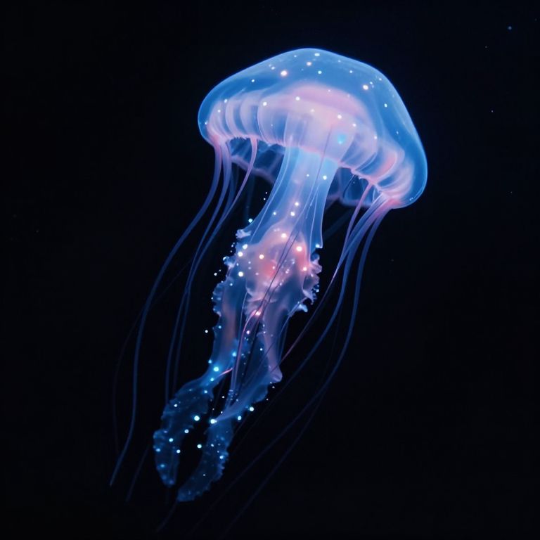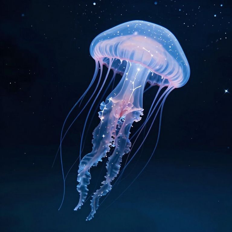 Suspended between the heavens and the abyss, a celestial jellyfish composed of stardust floats serenely, its ethereal glow casting a dreamlike luminescence over the glassy lake below, where constellations dance in its wake, evoking a profound sense of wonder and the infinite mystery of existence.