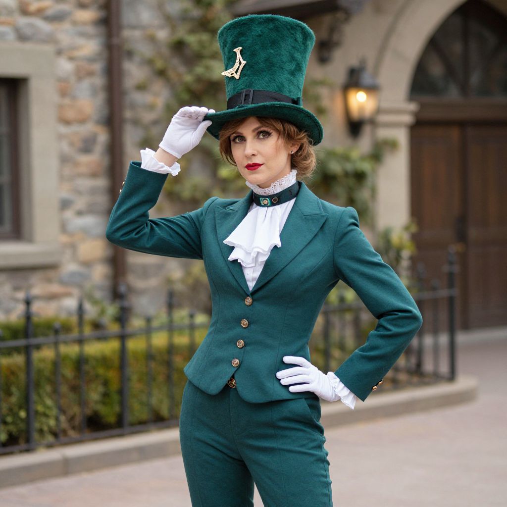 "Woman Teal Hatter Costume, woman in a green hat and jacket posing for a picture"