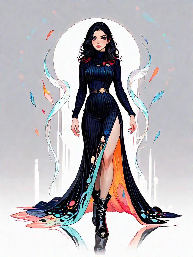 1girl, source_comics, realistic face, full body shot, Woman, contemporary, ribbed midi dress in burgundy, round neckline, long sleeves, side slit, black ankle boots with chunky heels, plain grey background.