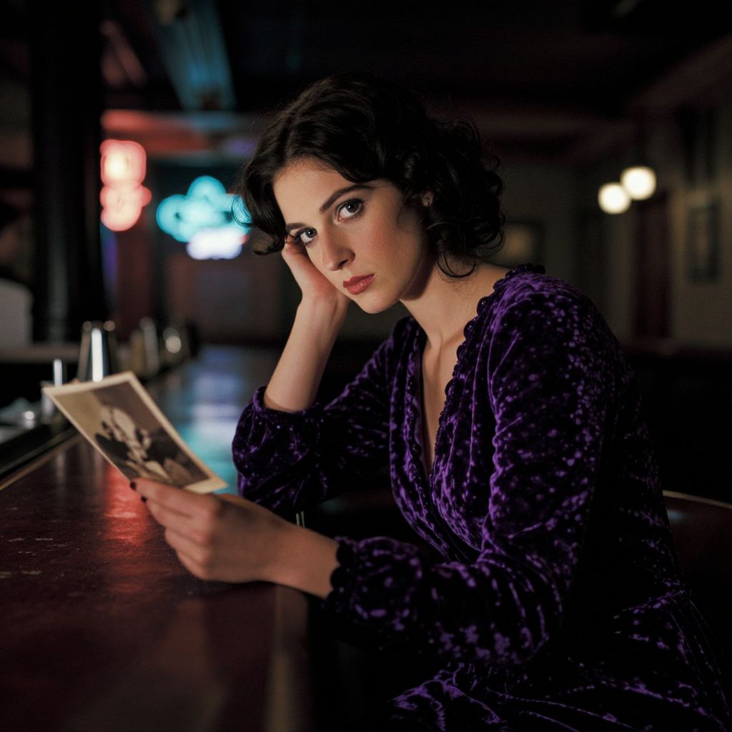 A photograph of a young woman with fair skin and dark, wavy hair, sitting at a dimly lit bar. She wears a rich, purple velvet dress with a deep V-neck and lace trim. She rests her chin on her left hand, gazing intently at a black-and-white photograph in her right hand. The background is blurred, featuring neon lights in blue and red, adding a moody, vintage ambiance. The bar's dark wooden surface reflects the subtle light, enhancing the intimate, nostalgic atmosphere of the scene.