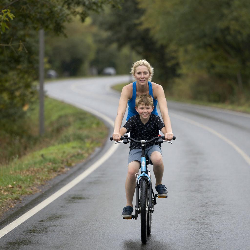 A photograph of a blonde woman riding on the back of a young boy on a bicycle, on a wet, curving road. She wears a blue sleeveless top, he wears a black shirt with white patterns. Trees line the road, with green grass on the left. The boy smiles widely, the woman looks forward.