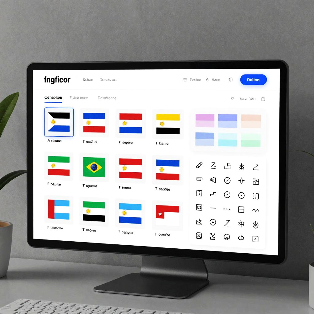 A flag designer online platform showing a detailed screen with various flag templates, color swatches, and symbol libraries, futuristic holographic displays, minimalist and intuitive design, a creative professional environment with focus on customization and precision