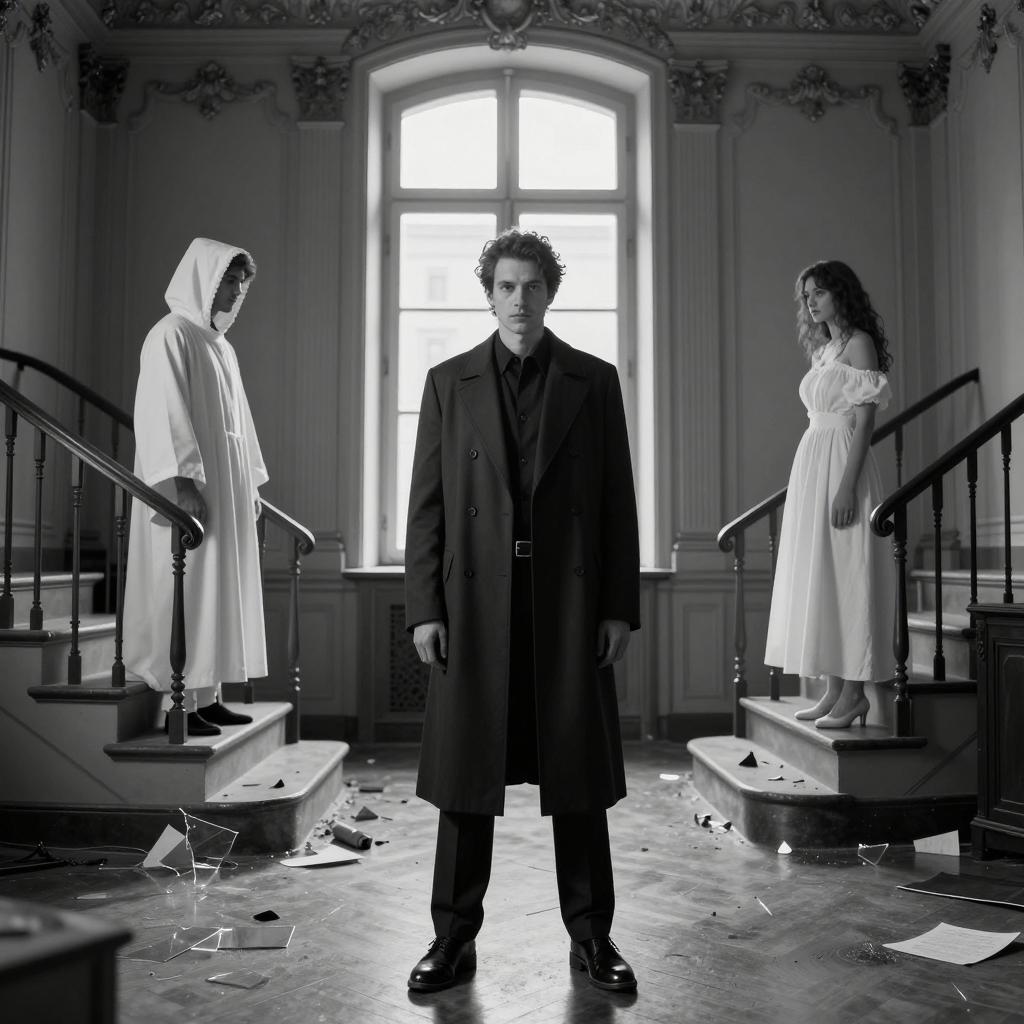 Black-and-white photograph. Man in long coat stands in ornate room with broken glass and scattered items. Another man in white hooded robe on stairs. Woman in white dress on right. Illuminated window in background. Shattered objects on floor.
