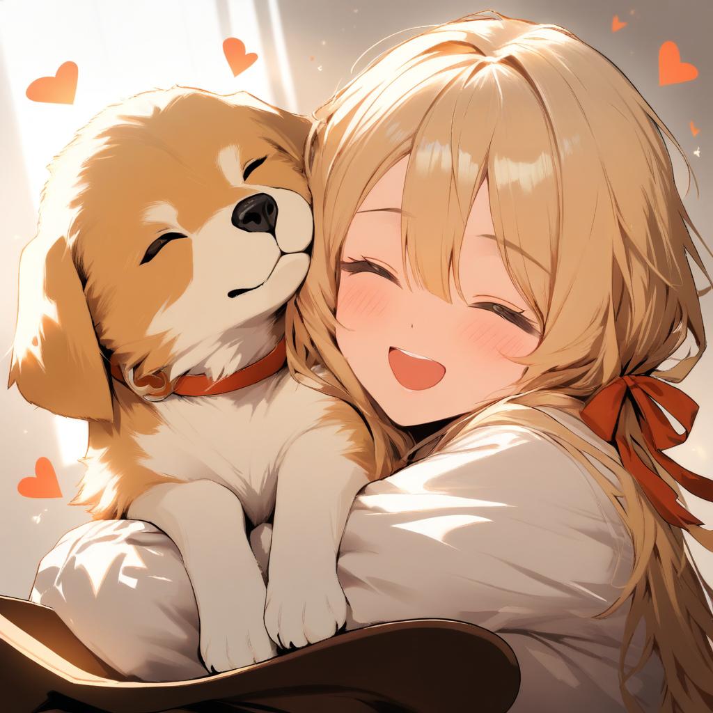 Swf, SFW, pyonta,1girl,blonde hair,heart,hat,unworn headwear,closed eyes,unworn hat,animal,dog,open mouth,hair ribbon,smile,solo,ribbon