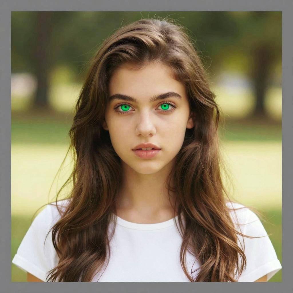 This is a bright, colorful photograph of a young woman with fair skin and striking green eyes. She has long, wavy brown hair and is wearing a simple white top. The background is a blurred mix of green and yellow, suggesting an outdoor setting. The image has a slightly overexposed effect, making her features pop. The photo is framed with a gray border.