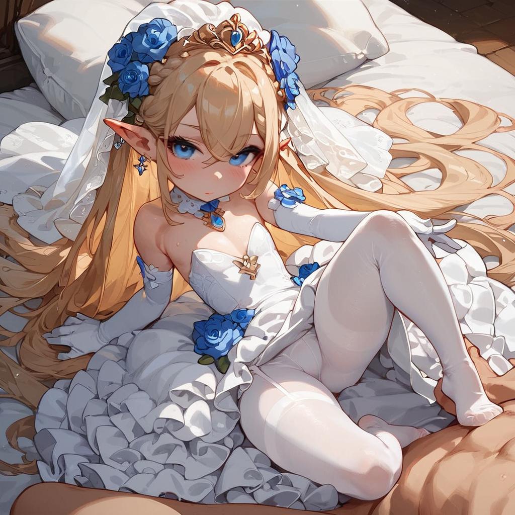 Score_9, score_8_up, score_7_up, score_6_up, score_5_up, score_4_up, source_anime, 1girl, looking at viewer, jewelry, pointy ears, shortstack, flat chest, outstretched leg, spiralcurl hair, wedding dress, white elbow gloves, white pantyhose, no shoes
