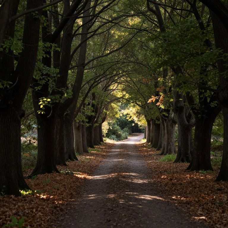 Photograph of a serene, tree-lined path in a forest. Tall, dark brown trees with thick trunks and green, sunlit leaves form a natural arch overhead. The ground is covered in brown, fallen leaves, and the path is dirt, leading to a bright, sunlit area in the distance. Dappled sunlight filters through the leaves, creating a pattern of light and shadow on the path. The overall atmosphere is peaceful and inviting, with a strong sense of depth and perspective.
