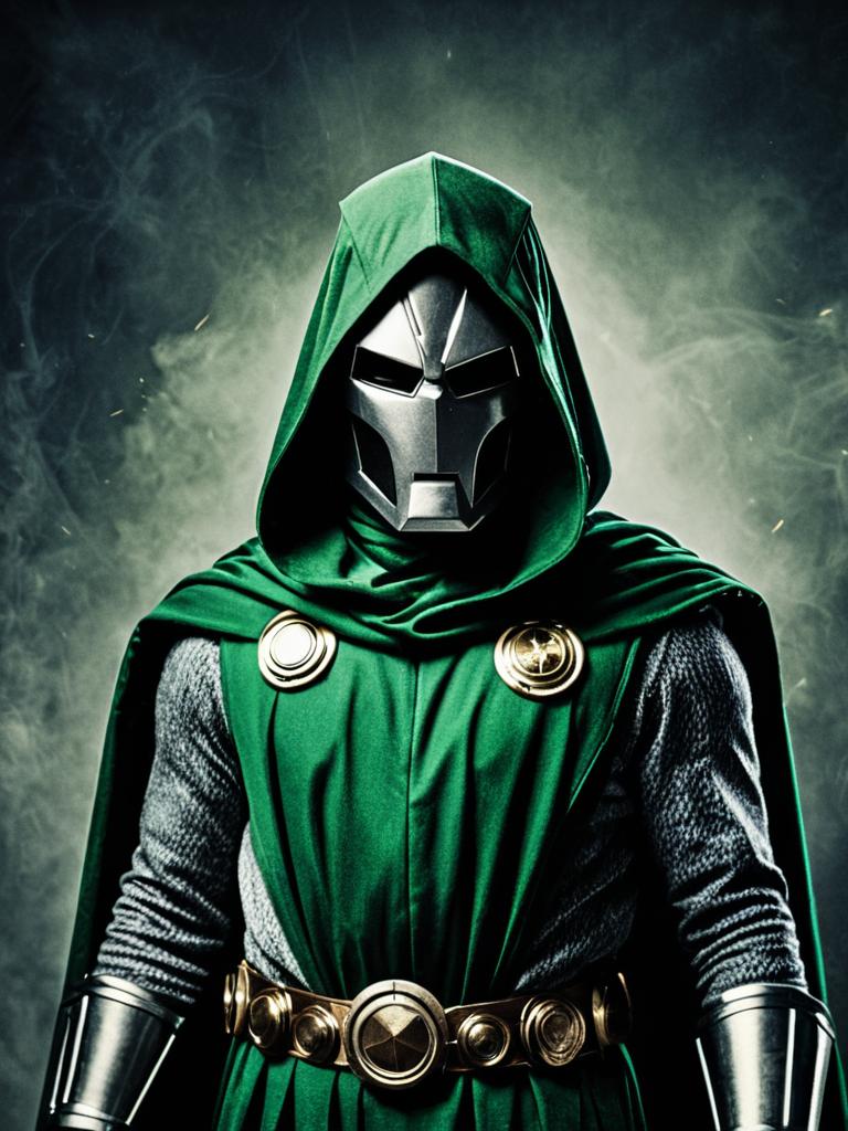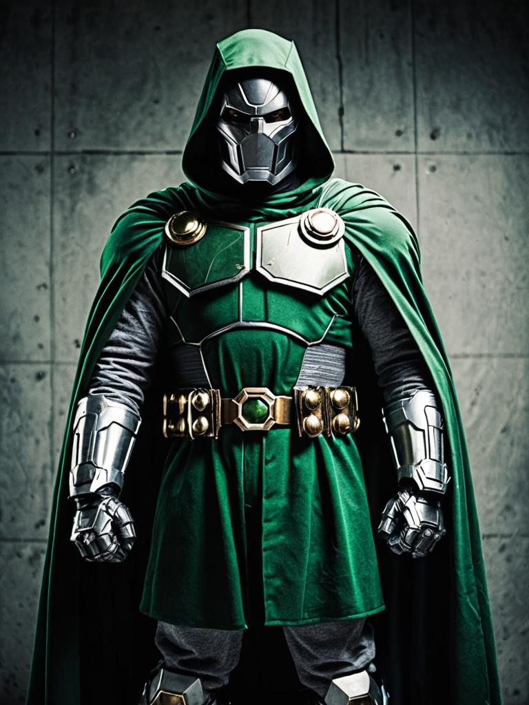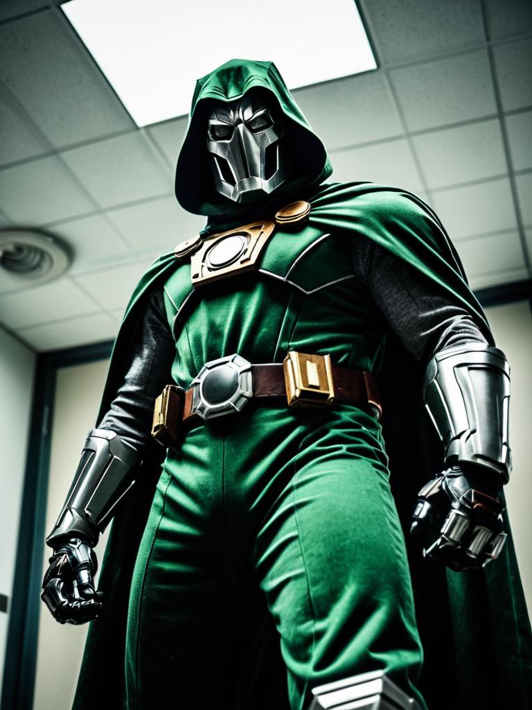 Man in Doctor Doom Costume, cinematic realism, dramatic low-angle villain photo