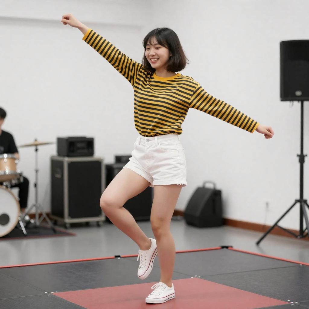 Photograph of a young woman with short black hair, wearing a yellow and black striped long-sleeve shirt and white shorts, joyfully dancing on a red and black stage. She is smiling widely, with one leg raised and arms outstretched. The background is a bright, white-walled room with musical equipment visible.