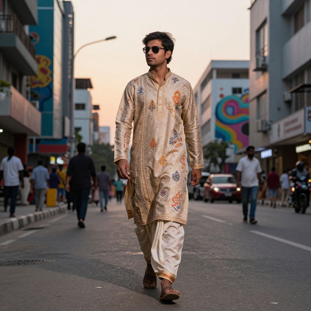 A modern urban landscape at sunset, a young man in a stylish dhoti kurta with hand-painted motifs walks through a bustling city street, blending traditional attire with contemporary fashion, colorful street art on walls, dynamic lighting, cinematic composition, Flux style.