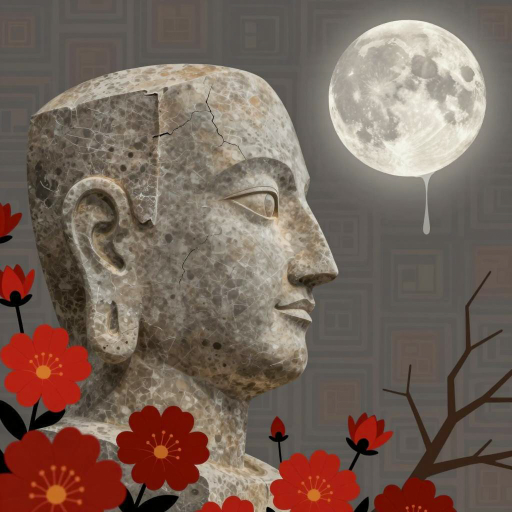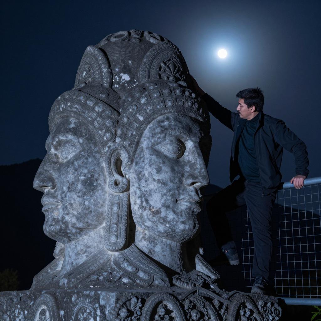 A large stone statue with two prominent human-like faces, lit by blue moonlight. A man in dark clothing climbs a wire mesh fence on the right, gripping the mesh with his left hand. The man has short dark hair, a mustache, and is wearing a dark jacket and pants. The statue's faces are ured and weathered. The background includes a dark, cloudy night sky and faint mountain silhouettes.