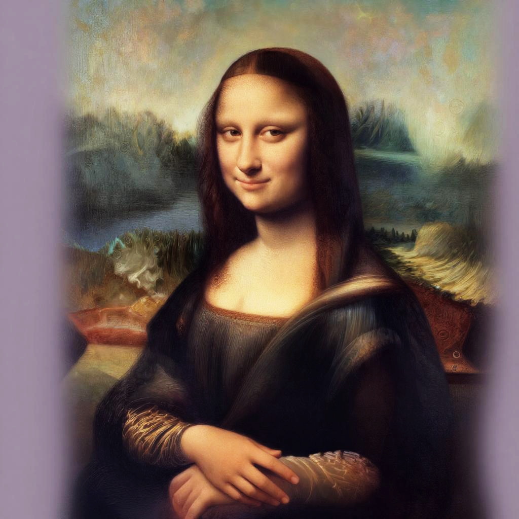 Digital artwork blending Leonardo da Vinci's "Mona Lisa" with a futuristic, neon-lit landscape. The Mona Lisa's enigmatic smile is set